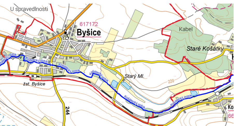 - Úsek toku procházející obcí Byšice: ř. km 13,4 až 8,3